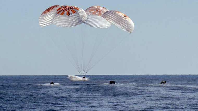 یہ خلا باز سپیس ایکس کی ایک مخصوص کیپسول میں سوار ہو کر بحرالکاہل میں پیراشوٹ کے ذریعے اترے۔